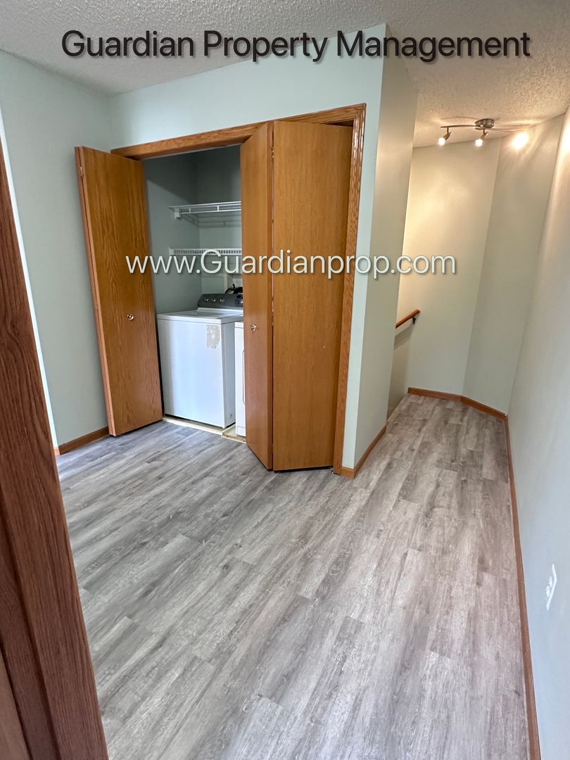 Upstairs you have a landing area with laundry space and full bathroom. The primary bedroom has a walk in closet and 2nd bedroom (not shown) is next to that.
